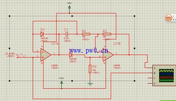 绝对值电路起全波整流器的作用。正输入电压导致第一个放大器充当一个具单位增益的反相器。第二个放大器再次对该输出进行反相,以产生一个正输出电压。负输入电压使第二个放大器的正输入朝正向移动,达到一个数值为2/3Vin的电压。由第二个放大器以3/2的增益对此电压进行放大也将产生一个与输入电压相等的正输出电压。